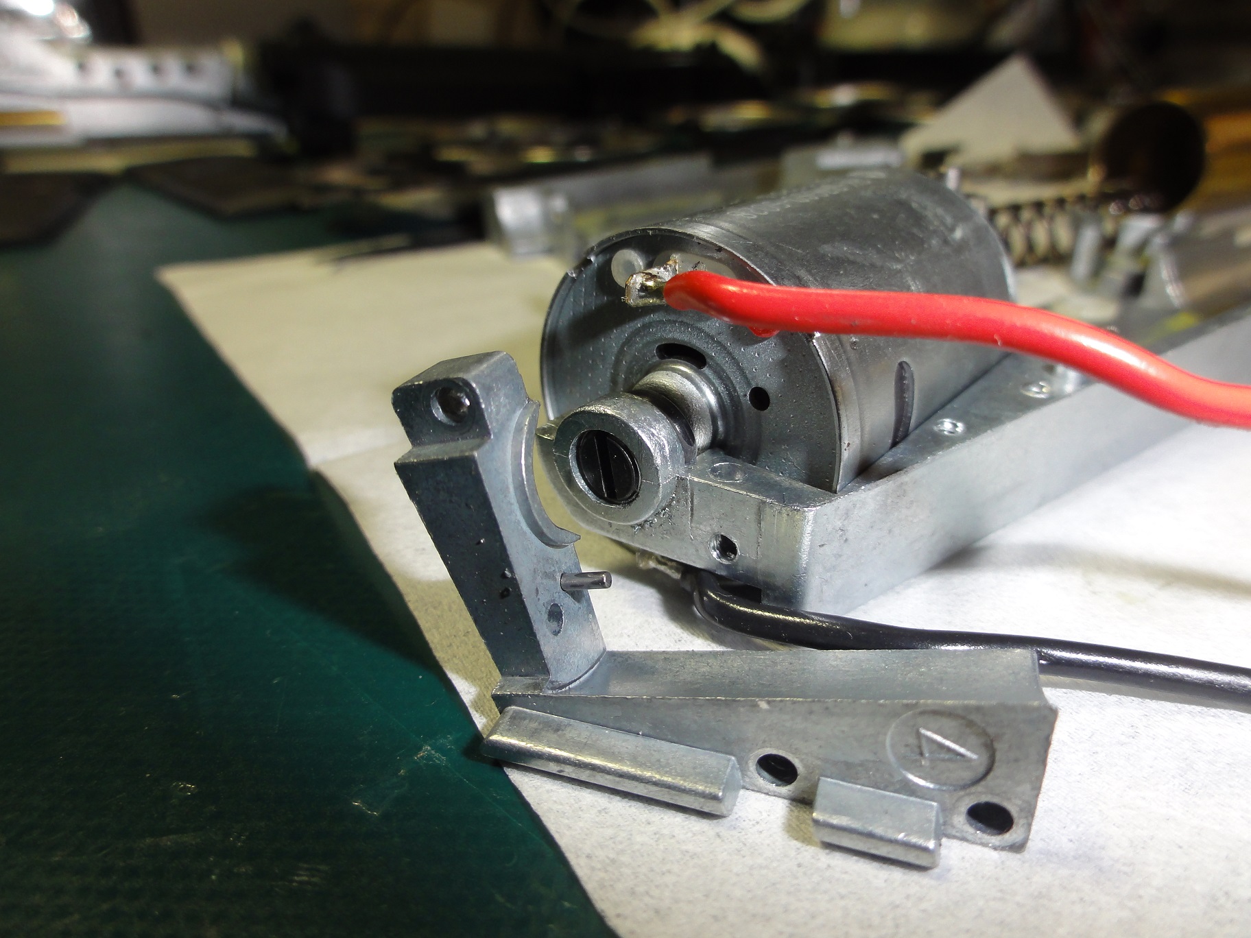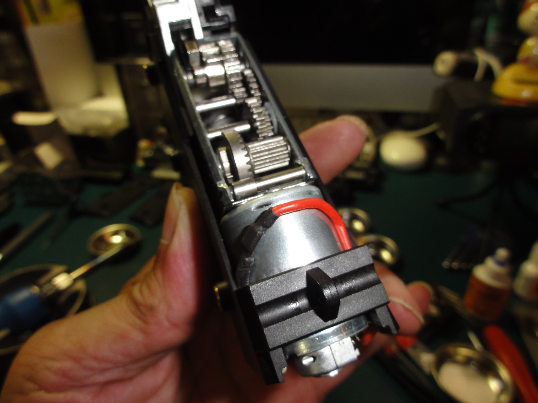 モーターを乾電池1本で駆動してギヤの当たり、音を確認、モーター位置も調整