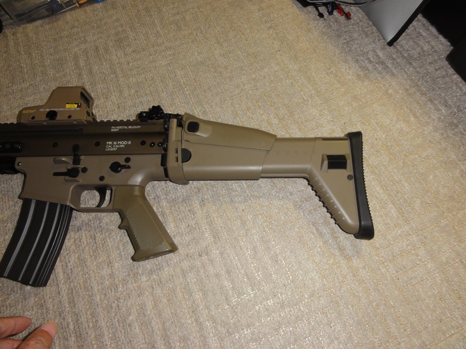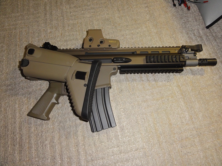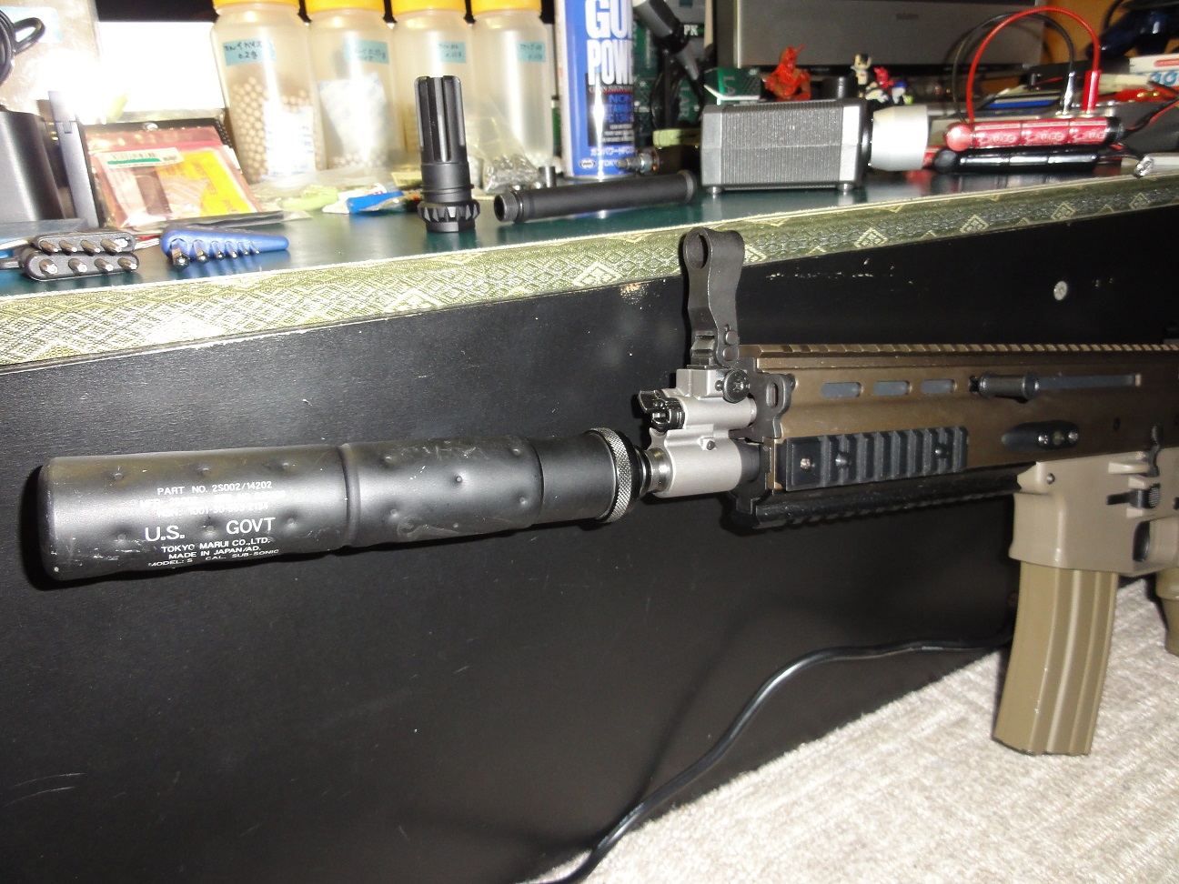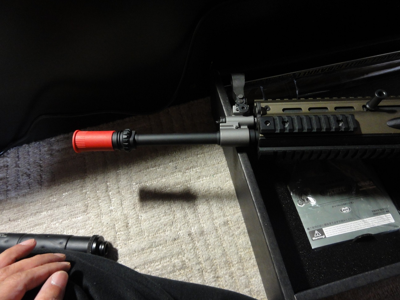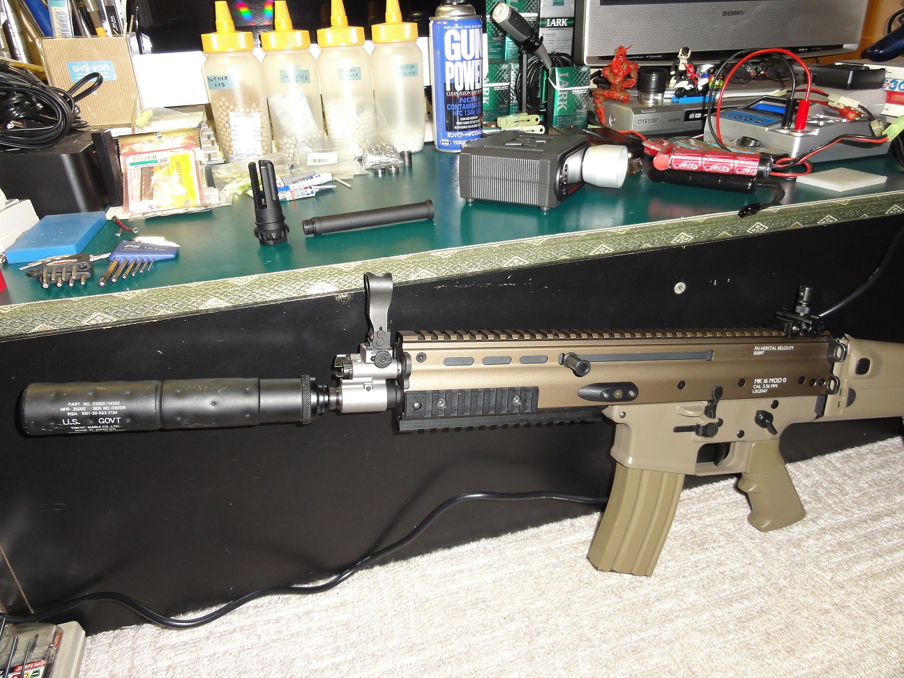 まだあった次世代電動ガンSCAR-L FNエルスタール社の出したSCAR-L フラット・ダークアースカラー どう言うわけかH&KやFNの銃器が多い管理人? 安く購入できたのはいいけど結局ライラクスの2ウェイバレルを組むのか まずは箱だし性能を・・・ まあ、こんなもんか次世代なら アウターバレルを組み終わりチェンジしてみた絵 これだったらCQCシリーズを買えよと言う話・・そこは大人の事情で タクティカルサイレンサーを装備して楽しみました ハイダーはM16用にしてコンパクトに、刻印もきれいです ストックは折りたたみ式、6段に伸縮、チークバッドも2段変更可 インナーバレルは300mmSCAR-L用のためハイダーの中まできています ここで再度計測です 弾はマルイバイオ弾0.2gですモーターはEG1000+リポ7.4v2200mAhで運用 満足いく性能になりました。 [0回] コメント コメントを書く コメントを書く コメント送信