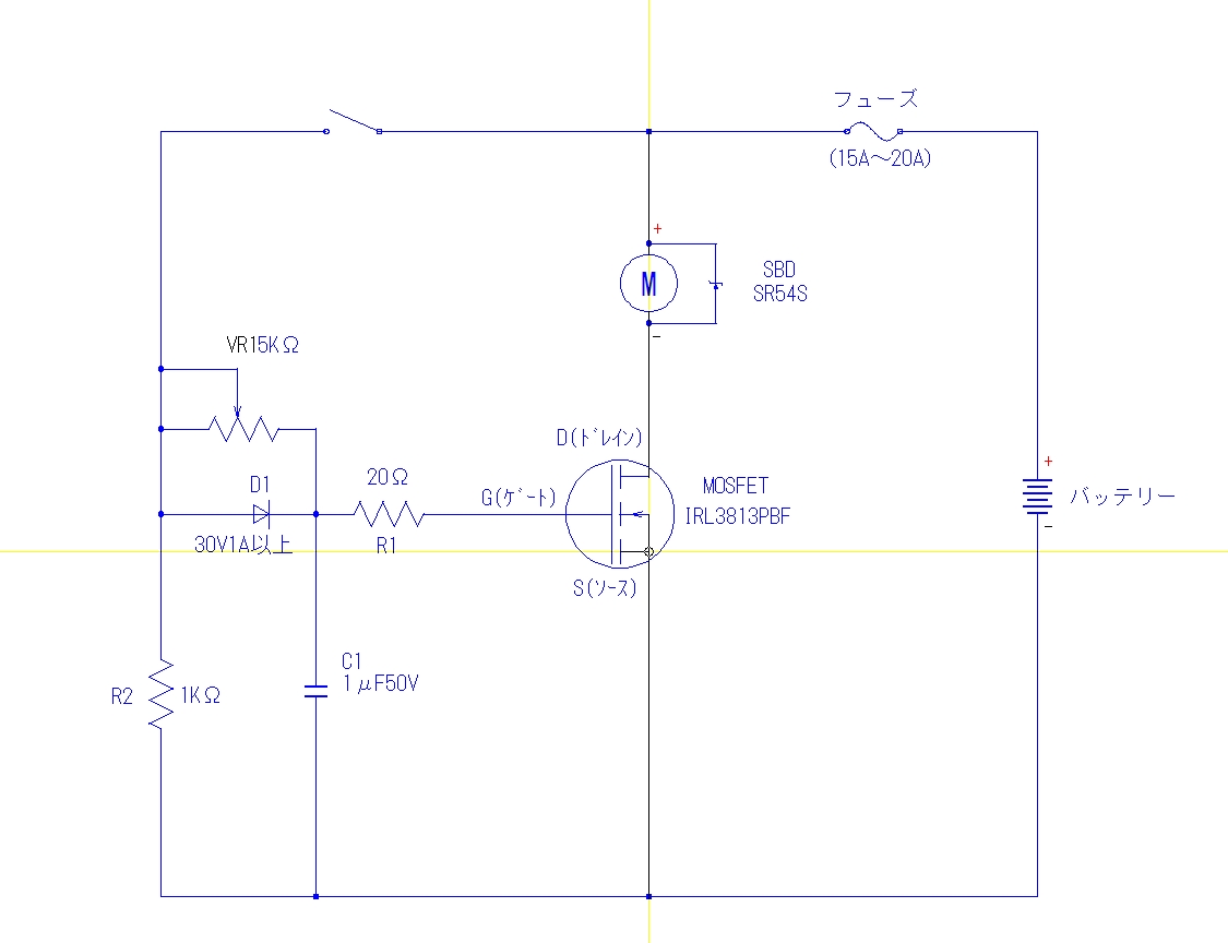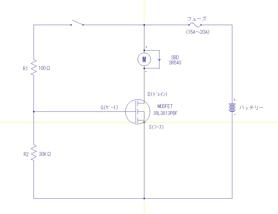 スイッチを入れるとD1からR1にそしてゲートに電気は流れます