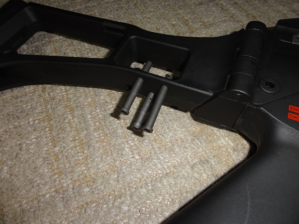 まずは通常分解3本のピンを抜き取り、ピンはストック下部の穴に刺して紛失防止