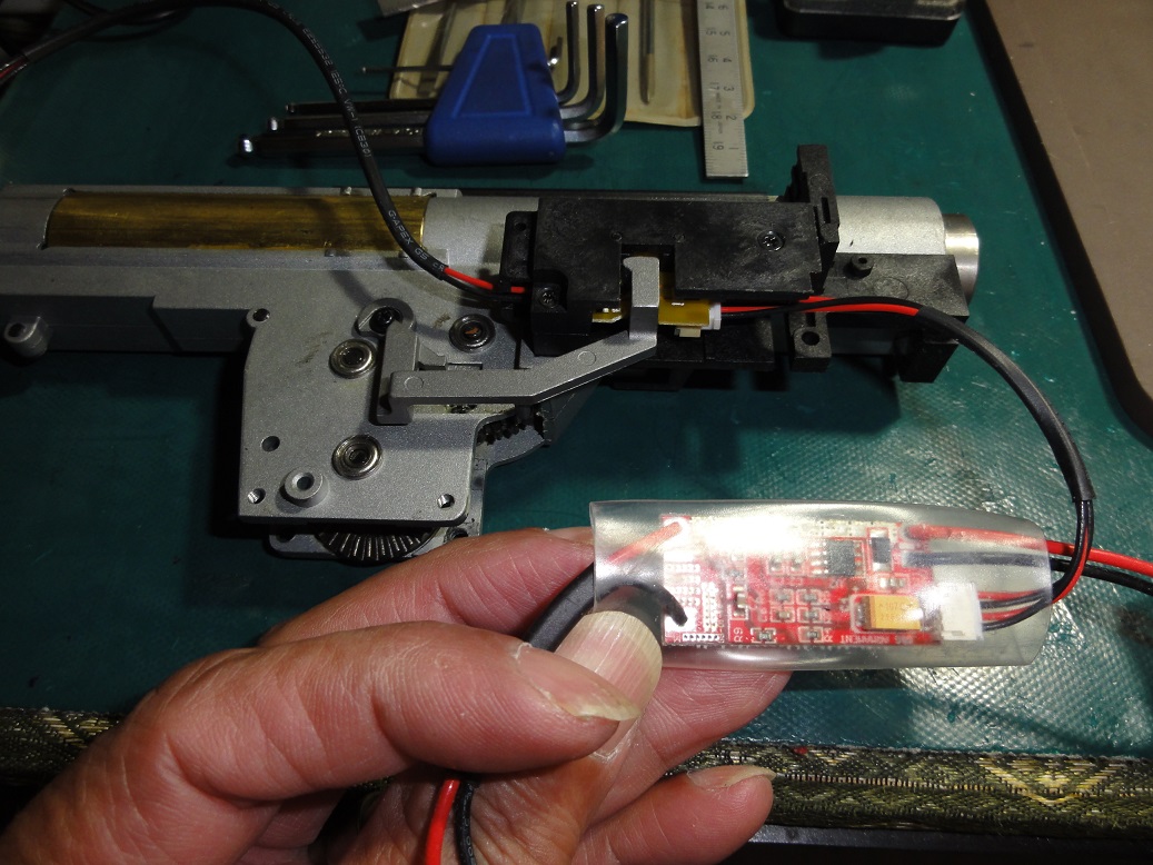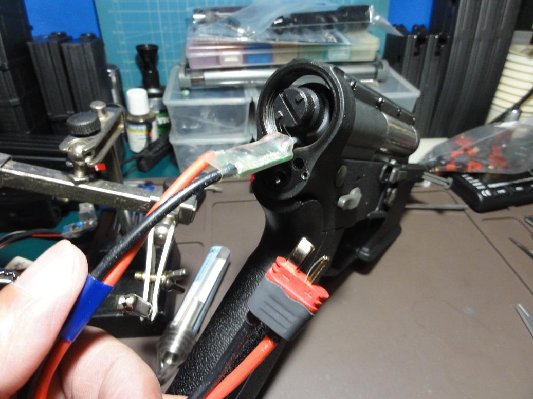 接続は銃側と基盤はつながっている状態でプログラムカードをつなぎ最後にバッテリーをつなぐ、