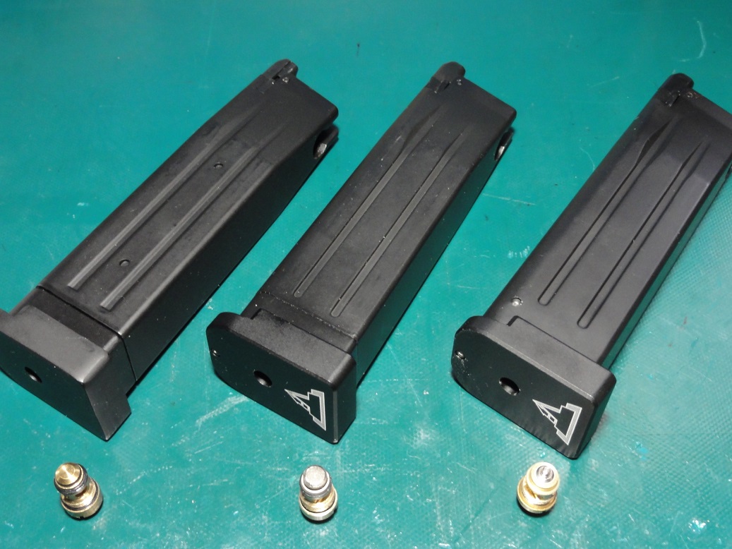 左からAPS、ダブルベル、ダブルベルCO2用マガジンと並べました。