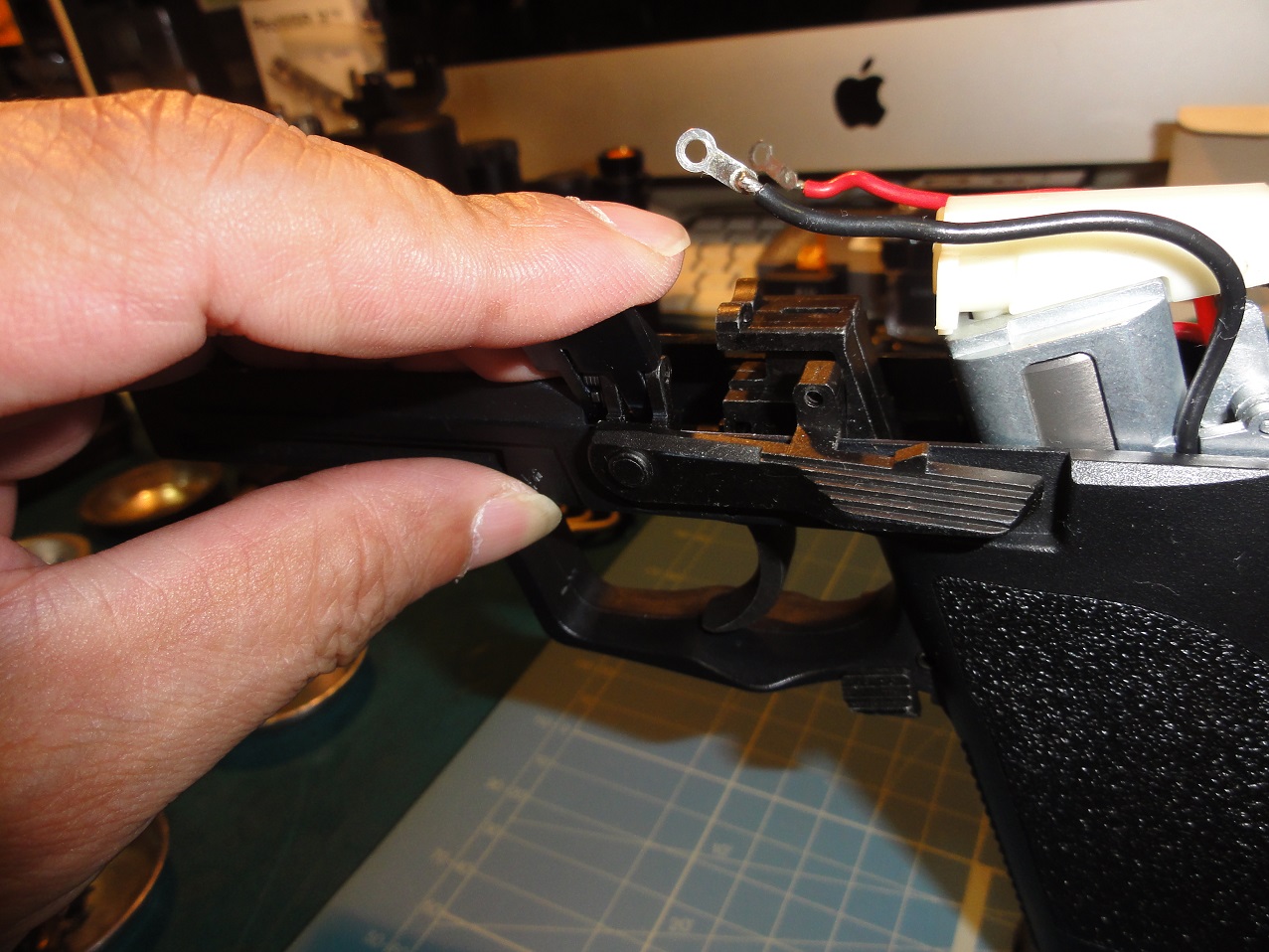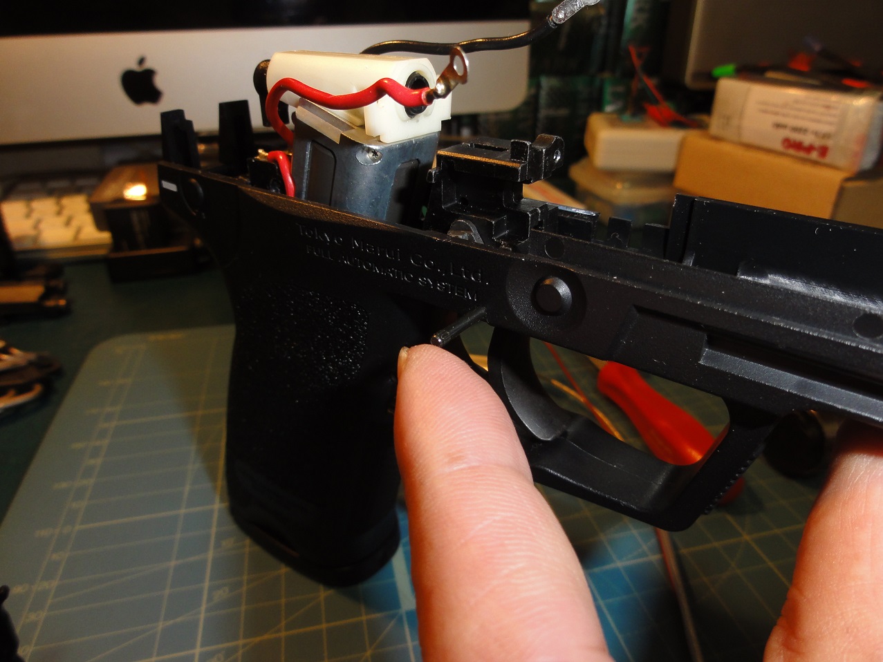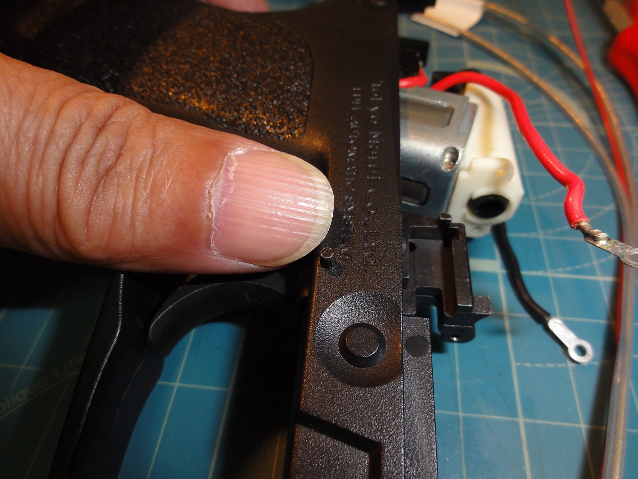 トリガーユニットを戻し、ピンの方向を気を付け、フレームの右側から差し込む