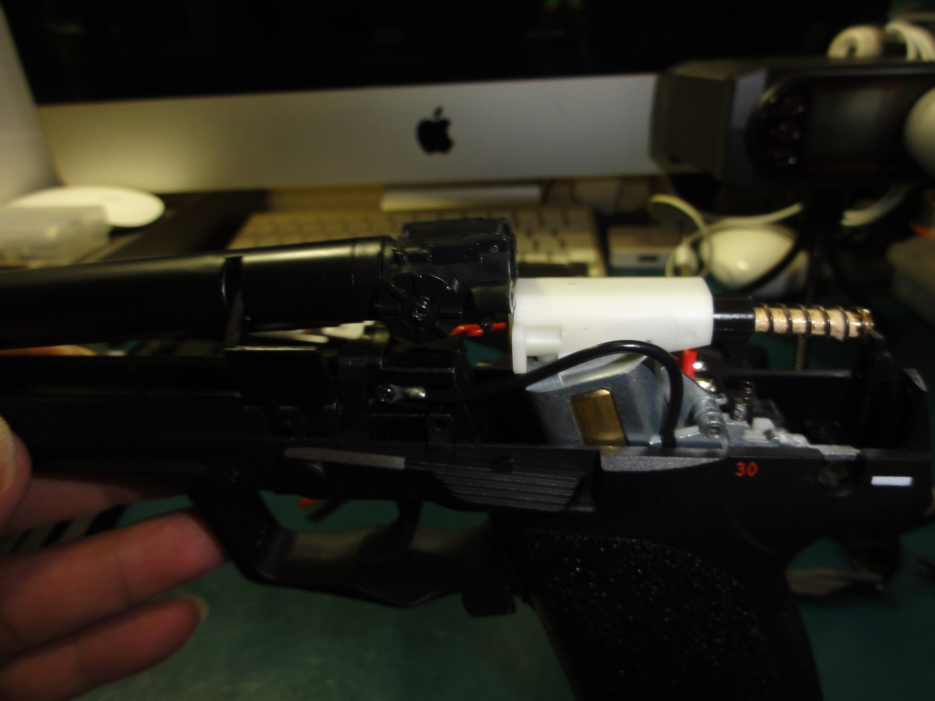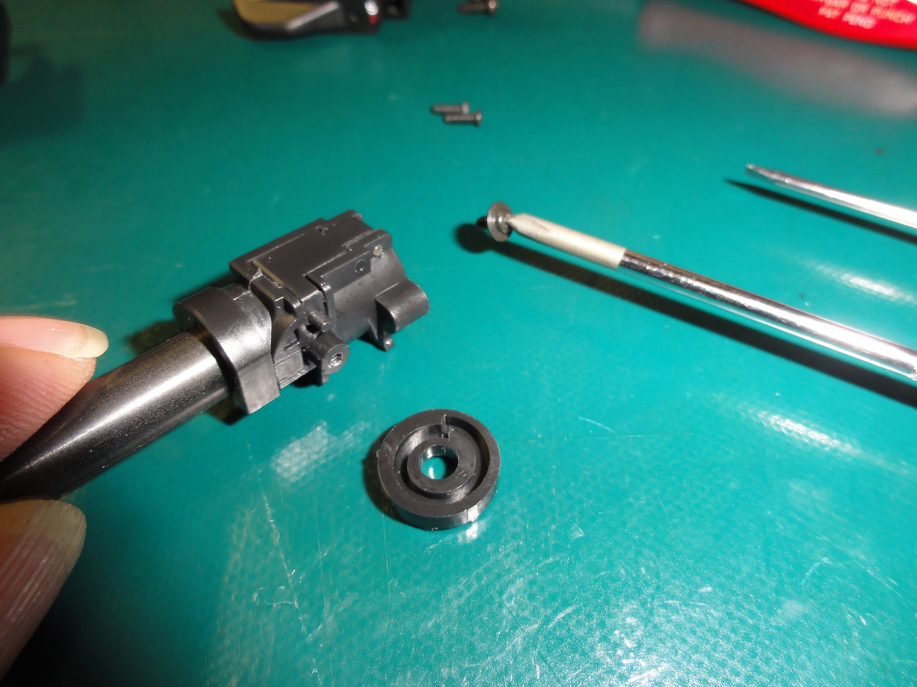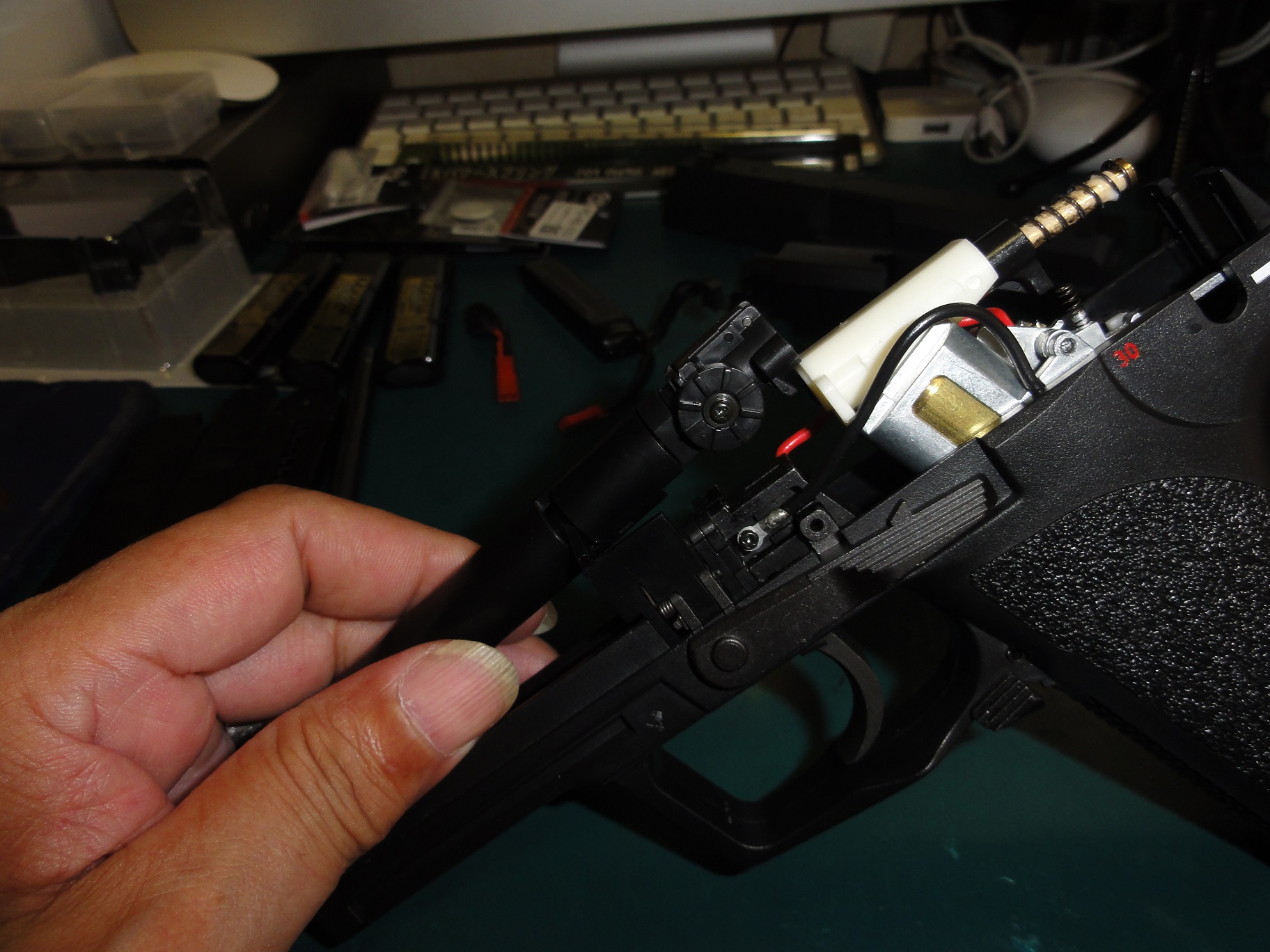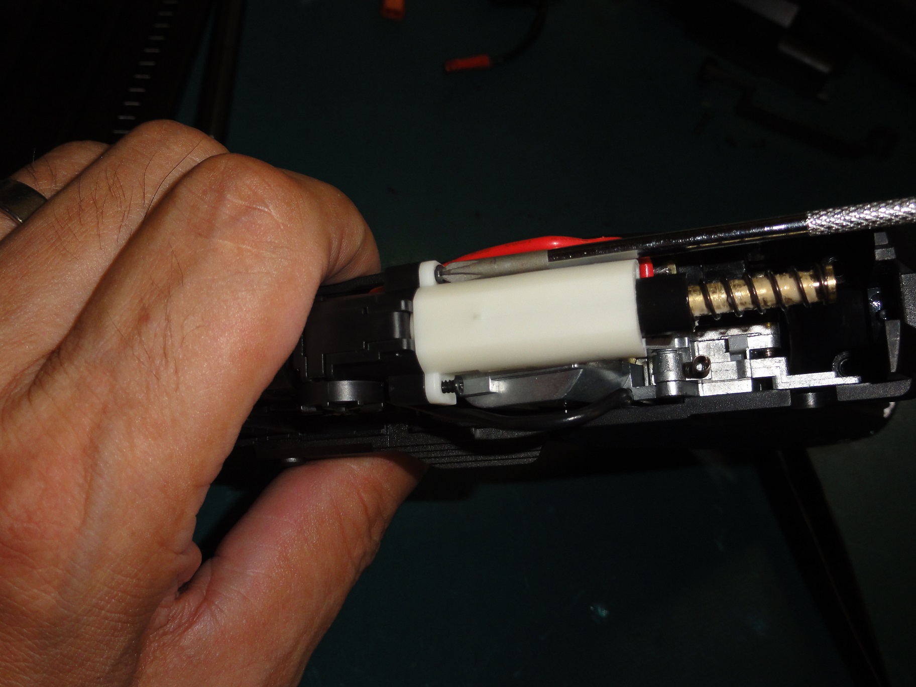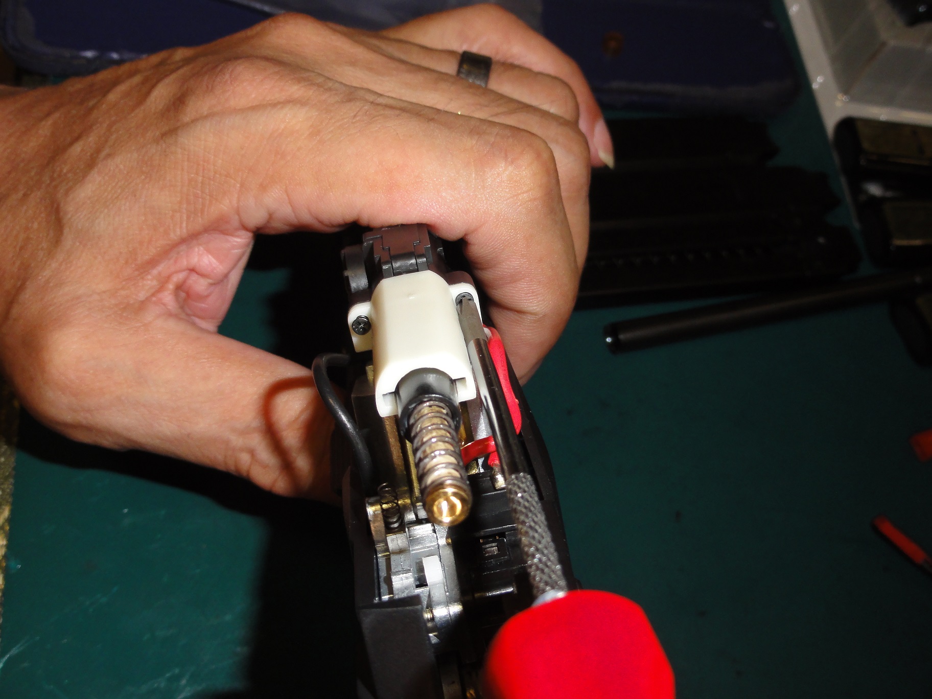写真を参考にして仮置きノズルスプリングを縮めハンマーユニットを収めます