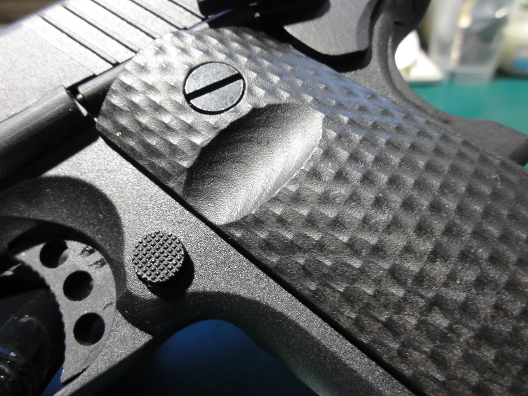 このBKgrip使用はぱっと見あまりわからないがマガジンキャッチ横くびれ部分